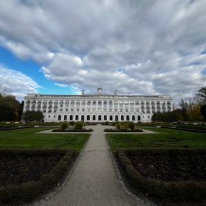 Le bâtiment en calcaire blanc s'étend dans le paysage avec des ailes symétriques, des colonnes et une terrasse d'observation sur la côte baltique.