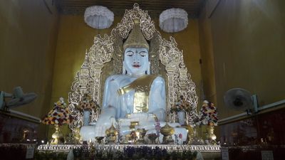 Le Temple du Bouddha Kyauktawgyi est un sanctuaire bouddhiste situé près de la colline de Mandalay qui abrite une statue colossale de Bouddha. La figure a été sculptée à partir d'un seul bloc de marbre vert pâle extrait de la carrière de Sagyin et mesure environ 11 mètres de hauteur.