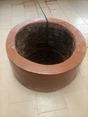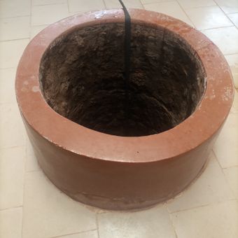 Le puits circulaire en pierre descend profondément dans le sol, permettant l'accès à l'eau par des mécanismes traditionnels de corde et seau.