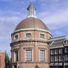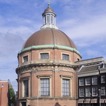 La Ronde Lutherse Kerk présente un dôme en cuivre surplombant le canal, avec des éléments architecturaux classiques et un bas-côté dans la partie arrière.