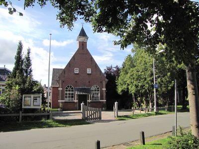 Woning onder zadeldak tegen forse topgevel met vlechtingen in het metselwerk en op de zolderverdieping twee vierruitsvensters