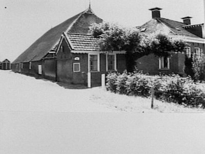 Woning onder zadeldak tegen forse topgevel met vlechtingen in het metselwerk en op de zolderverdieping twee vierruitsvensters