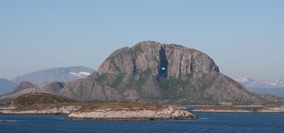 Torghatten est une montagne de granit dans la municipalité de Brønnøy qui s'élève 258 mètres au-dessus du niveau de la mer et présente un tunnel naturel qui la traverse. Le tunnel mesure environ 160 mètres de long, 35 mètres de haut et 20 mètres de large, créant un trou frappant qui passe complètement à travers la montagne.