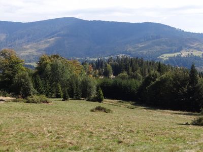 La zone d'observation de Hala Redykalna sous le sommet permet d'apercevoir les monts Tatra et la chaîne des Beskides.