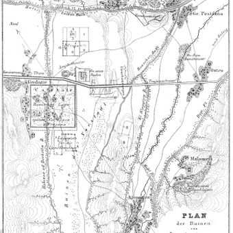Le complexe archéologique contient des vestiges de temples, un amphithéâtre, des bâtiments publics et des murs de fortification sur 130 hectares.