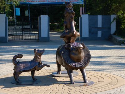 Cette composition en bronze relie les œuvres littéraires d'Anton Tchekhov à l'art public par la représentation des personnages animaux de son récit Kachtanka.