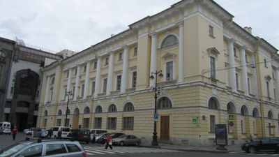 Le Musée d'État du Théâtre et de la Musique occupe l'ancien bâtiment de la Direction des Théâtres Impériaux, conçu par l'architecte Carlo Rossi.
