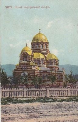 La Cathédrale Alexander Nevsky est un bâtiment religieux néo-byzantin à Chita présentant plusieurs dômes décorés, des arcs en brique apparente et de grandes fenêtres. La structure suit le style architectural typique de cette tradition sous l'Empire russe.