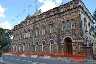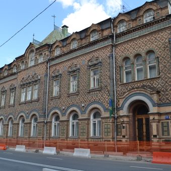 Le bâtiment de trois étages présente des fenêtres en arc, des céramiques multicolores et des éléments décoratifs traditionnels de l'architecture médiévale russe sur sa façade.