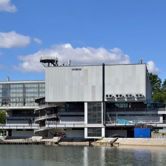 Le Pavillon numéro 38 présente une architecture composée de béton et de verre, avec des éléments géométriques caractéristiques du modernisme soviétique.