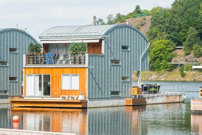 Marinstaden comprend des habitations flottantes construites sur des plateformes en béton dans la baie de Svindersviken, reliées aux réseaux municipaux.