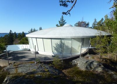 La villa se présente comme une structure circulaire à deux niveaux, avec un toit en forme de dôme composé d'éléments en plastique renforcé de fibre de verre.