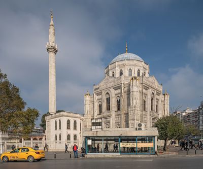 L'extérieur présente quatre minarets d'angle influencés par l'architecture indienne, la distinguant des autres mosquées ottomanes du dix-neuvième siècle.