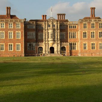 La demeure seigneuriale s'étend sur trois niveaux avec des ailes symétriques, des murs en pierre décorés et de nombreuses cheminées qui s'élèvent dans le ciel du Hampshire.