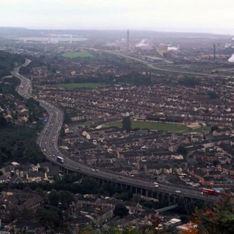 Port Talbot est une ville sur la baie de Swansea, dans le sud du Pays de Galles, avec un port et une grande aciérie à l'est. Les rues s'étendent entre la bande côtière et les collines boisées en arrière-plan, où les quartiers résidentiels pénètrent dans des vallées douces.