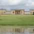 La façade sud de Stowe House s'étend sur 140 mètres et présente des pilastres corinthiens soutenant un portique aux éléments architecturaux classiques.