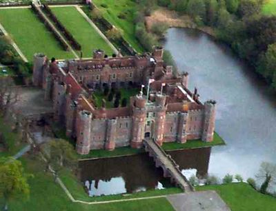 La forteresse en briques rouges se dresse avec ses douves et jardins sur quinze acres de terrain près du village de Herstmonceux.