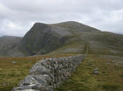 Beinn Dearg est une montagne des Highlands écossais s'élevant à 1084 mètres avec des pentes rocheuses abruptes et des caractéristiques distinctives. Le terrain est creusé de profondes ravines verticales et de surfaces rocheuses en couches qui créent son profil particulier.