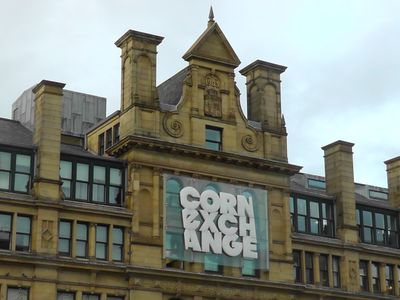 Le bâtiment Corn Exchange présente une architecture eduardienne avec de hautes fenêtres et une configuration triangulaire à Exchange Square.