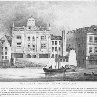Le théâtre de Dorset Garden se dressait au bord de la Tamise, avec une scène principale de 15 mètres de profondeur et 9 mètres de hauteur.