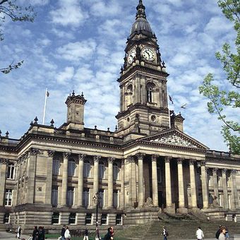 Le Bolton Town Hall s'élève sur la place Victoria avec des proportions néoclassiques, surmonté d'une tour d'horloge baroque et encadré par un sous-sol surélevé avec deux étages principaux au-dessus. À l'intérieur, le bâtiment contient deux salles publiques conçues pour les représentations et les rassemblements, accessibles aux visitants et aux groupes locaux.