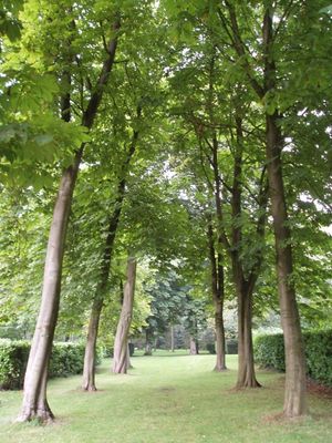 Les arbres et les allées gazonnées forment un espace extérieur de 3,8 hectares avec des sections représentant les éléments d'une cathédrale comme la nef et le transept.