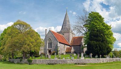 L'eglise Saint-Andre est un batiment en pierre du 14e siecle qui se dresse sur une butte aux murs de silex pres de la riviere Cuckmere, avec une tour centrale et un plan en croix. La nef et le chœur ont la meme longueur, donnant a l'eglise une structure equilibree et symetrique.