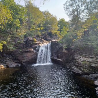 Le grand bassin au pied de la cascade porte le nom de Baignoire de Rob Roy, reliant le site aux légendes écossaises locales. Ce nom montre comment les caractéristiques naturelles ici s'entrelacent avec des récits que les visiteurs entendent toujours aujourd'hui.