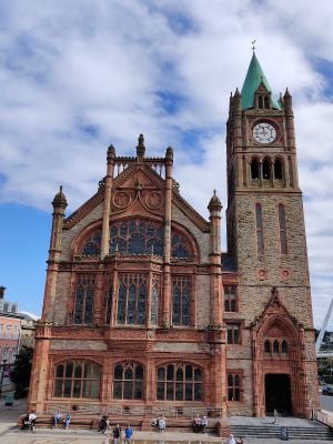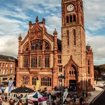 La Guildhall de Derry est une mairie d'Irlande du Nord caractérisée par une architecture néogothique avec des éléments Tudor, construite en grès rouge et couronnée d'une tour d'horloge inspirée par la Elizabeth Tower de Londres. Le bâtiment contient des équipements accessibles incluant des ascenseurs et des rampes.