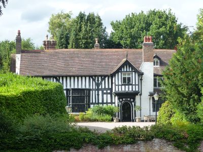 L'ancien presbytère présente une construction traditionnelle à colombages noir et blanc du Cheshire avec des éléments décoratifs et une grande salle ouverte.
