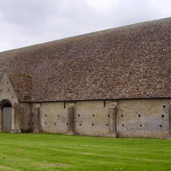 Great Coxwell Barn est un grand bâtiment en pierre avec un toit en ardoise dans un village à l'ouest d'Oxford. Les murs sont en pierre brute avec des contreforts en blocs taillés, et le toit repose sur d'épais poteaux en bois.