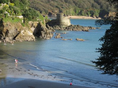 La tour semi-circulaire de quatre étages du château de Salcombe s'élève à 7 mètres sur un promontoire rocheux, reliée à une structure rectangulaire de 6 mètres.