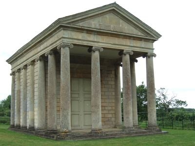 Le Temple de l'Harmonie se dresse dans Mill Wood, avec un toit en ardoise, des pignons à fronton et des colonnes ioniques entourant sa structure rectangulaire.