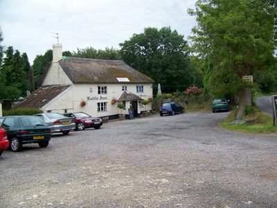 The Bottle Inn, Pub au toit de chaume à Marshwood, Angleterre.