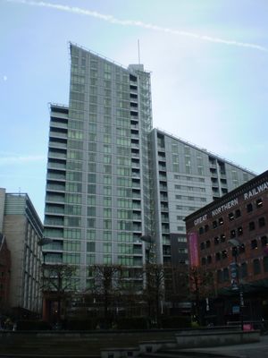 Le bâtiment se dresse à côté du Great Northern Warehouse classé Grade II, illustrant la fusion entre espaces résidentiels modernes et structures industrielles.