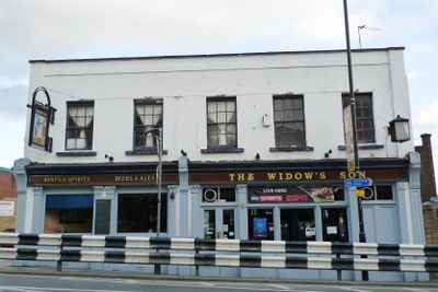 The Widow's Son présente une façade peinte en bleu avec des éléments architecturaux traditionnels au coin de Devons Road.