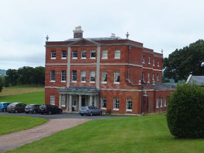 La construction présente une architecture géorgienne classique avec une façade symétrique et intègre la pierre locale du Devon dans sa structure.