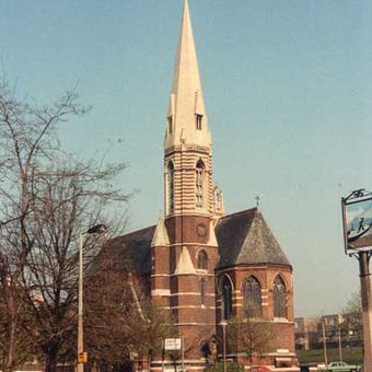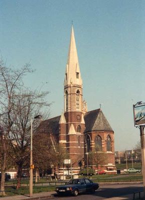 La structure victorienne en briques et pierres présente une flèche effilée, une double arcade dans la nef nord et des vitraux de Henry Holiday.