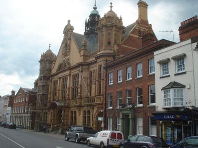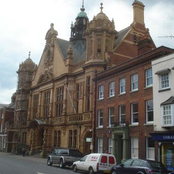 L'Hôtel de Ville de Hereford présente une architecture baroque édouardienne avec des parements en terre cuite, sept fenêtres ornementales et une entrée centrale voûtée.