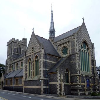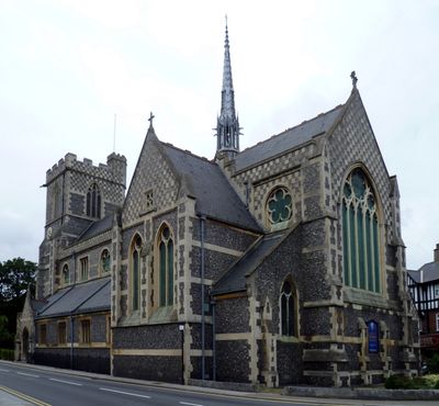 L'église Saint-Jean-Baptiste se dresse à l'intersection de High Street et Wood Street, présentant une structure en pierre avec des éléments architecturaux.