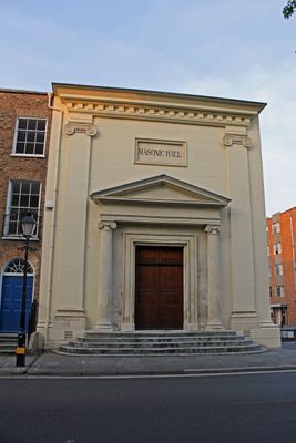 Le temple maçonnique présente une façade en stuc avec des pilastres ioniques, de grandes fenêtres et une porte principale en bois sur la rue The Crescent.