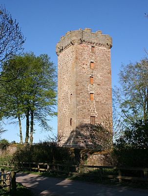 La tour nord-ouest subsistante du château de Burgie s'élève sur six étages avec un parapet et présente une tour d'escalier en encorbellement.