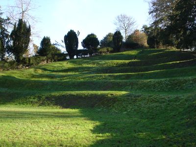 The Moot: a ringwork and bailey, earlier Roman settlement remains and later garden earthworks immediately east of the River Avon, scheduled monument in Downton, Wiltshire, England, UK