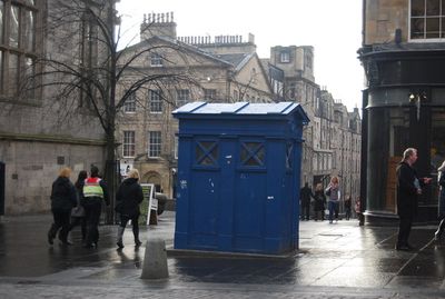La cabine d'appel de police sur South Bridge est une petite structure métallique bleue avec des fenêtres rectangulaires et une connexion téléphonique directe pour les urgences. Elle est classée bâtiment de catégorie B protégé, reconnue pour sa place dans les archives architecturales d'Édimbourg.