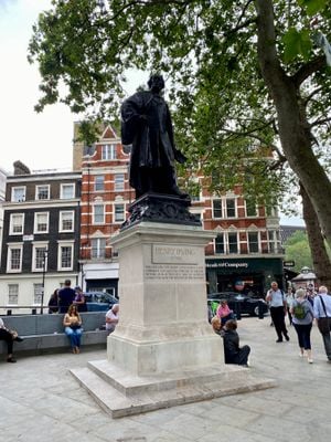 La figure en bronze de Henry Irving repose sur un piédestal en calcaire de Portland, représentant l'acteur en position formelle sur Charing Cross Road.