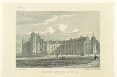 Rushbrooke Hall etait une demeure seigneuriale en brique construite vers 1550 avec un plan en forme de E et une cour centrale avec des tourelles d'angle. L'entree presentait un porche en pierre fine decor de sculptures representant les armoiries de la famille.