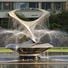 La fontaine émet de l'eau par de petites ouvertures dans la structure métallique, créant des motifs qui changent avec les mouvements rotatifs de la sculpture.