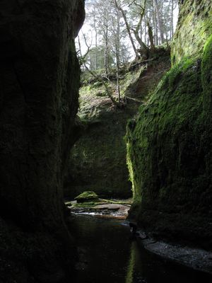 Finnich Glen est une gorge profonde creusée dans le grès rouge à Stirling, où s'écoule le Carnock Burn. Les parois couvertes de mousse tapissent le ravin étroit, et les rochers façonnés par l'eau forment des formes inhabituelles tandis que le cours d'eau poursuit son chemin.