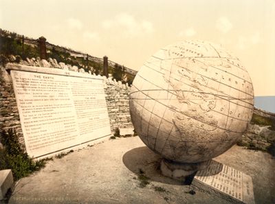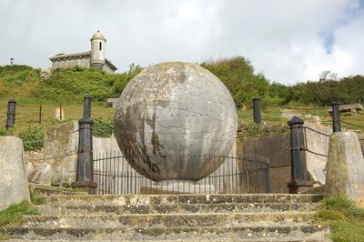 Le globe en pierre de Portland mesure 3 mètres de diamètre et repose sur une plateforme taillée dans la roche à 41 mètres au-dessus du niveau marin.