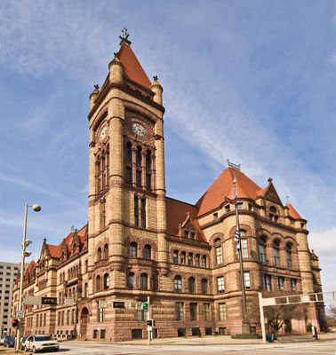 L'Hôtel de Ville de Cincinnati présente une tour horloge de neuf étages et quatre niveaux principaux construits en pierre du Wisconsin, Ohio, Missouri et Indiana.